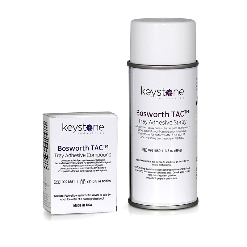 TAC Tray Adhesive Compound is a leading tray adhesive compound available in convenient spray cans or brush-on liquid for use with alginate impression materials. TAC Tray Adhesive Compound securely holds the alginate in the tray when the impression is removed from the patient’s mouth. TAC Tray Adhesive Compound is alcohol-based for faster drying and easier clean-up and can be dissolved with Isopropyl Alcohol.