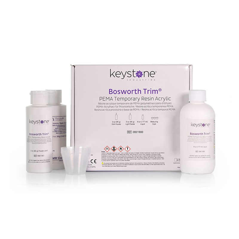 Trim® and Trim® II are leaders in temporary crown and bridge. Fast-setting, non-irritating PEMA formulated for extended use. The powder and liquid in each kit are identical in formula and the powders can be mixed to obtain specialty shades. The resin is dimensionally stable, will not distort when withdrawn from undercuts while setting.