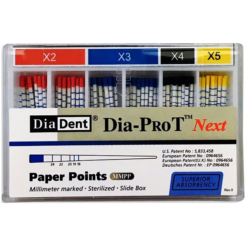 These points are millimeter-marked and are packaged in a convenient one-hand sliding-open package. Millimeter-marked points provide preliminary guidance in measuring the root canal depth before proceeding clinically with the application of gutta percha points.