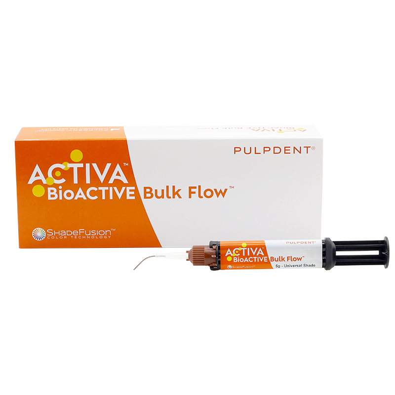ACTIVA BioACTIVE Bulk Flow is part of Pulpdent’s advanced ACTIVA patient treatment system. ACTIVA materials feature patient-centric benefits, such as natural remineralization support, along with SMART™ polymer technologies that allow for provider ease and efficiency.